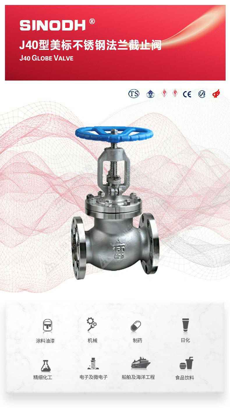 J40型美标不锈钢截止阀,为开云在线登录app官网-开云(中国)自主研发生产。本产品的设计制造符合美国国家标准ANSIB16.34,美国石油学会标准AP1 6D和AP I 600要求,产品结构紧凑密、刚性好、封性性能优秀是一种最常见的启闭阀,利用闸板的上下工作来接通(全开)和截断(全关)管道中的流体介质。