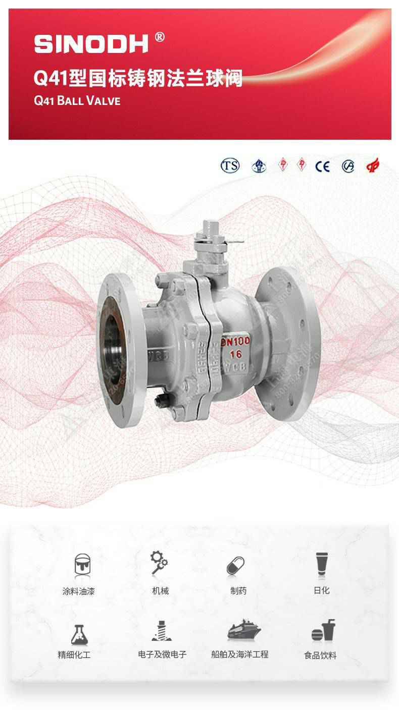 Q41型国标铸钢法兰球阀,为开云在线登录app官网-开云(中国)自主研发生产。本产品设计制造标准符合GB/T12237、GB/T12224标准。该产品的球体在介质压力作用下球体能产生一定的位移并紧压在出口端的密封面上,保证出口端密封。适用于水、溶剂、酸和天然气等一般工业介质也适用于工况恶劣的介质,如氧气、过氧化氢、甲烷和乙烯等介质。