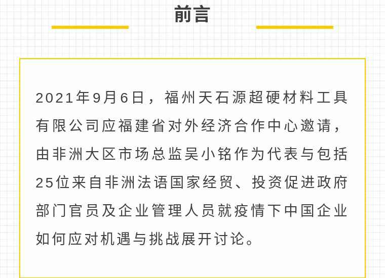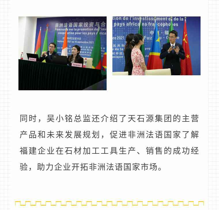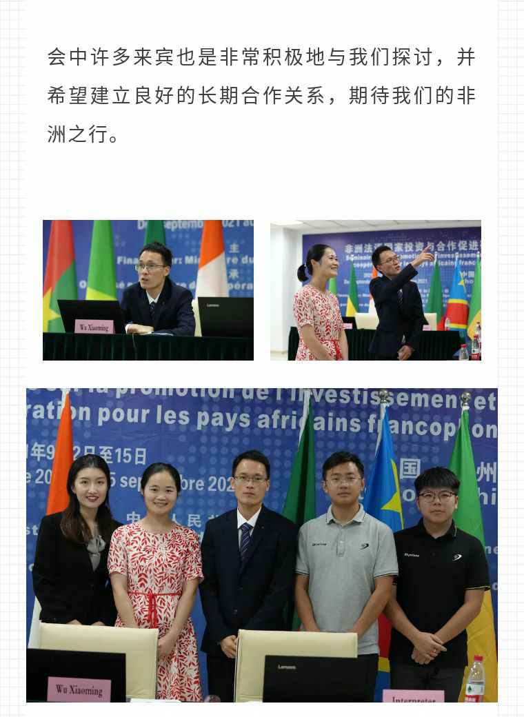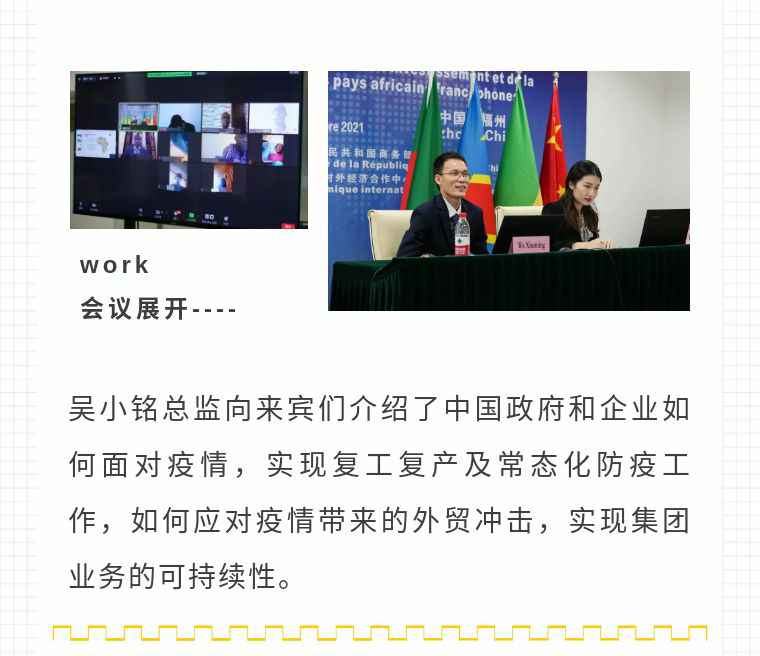 2021年9月6日,千亿体育(中国)官方网站应福建省对外经济合作中心邀请,由非洲大区市场总监吴小铭作为代表与包括25位来自非洲法语国家经贸、投资促进政府部门官员及企业管理人员就疫情下中国企业如何应对机遇与挑战展开讨论。